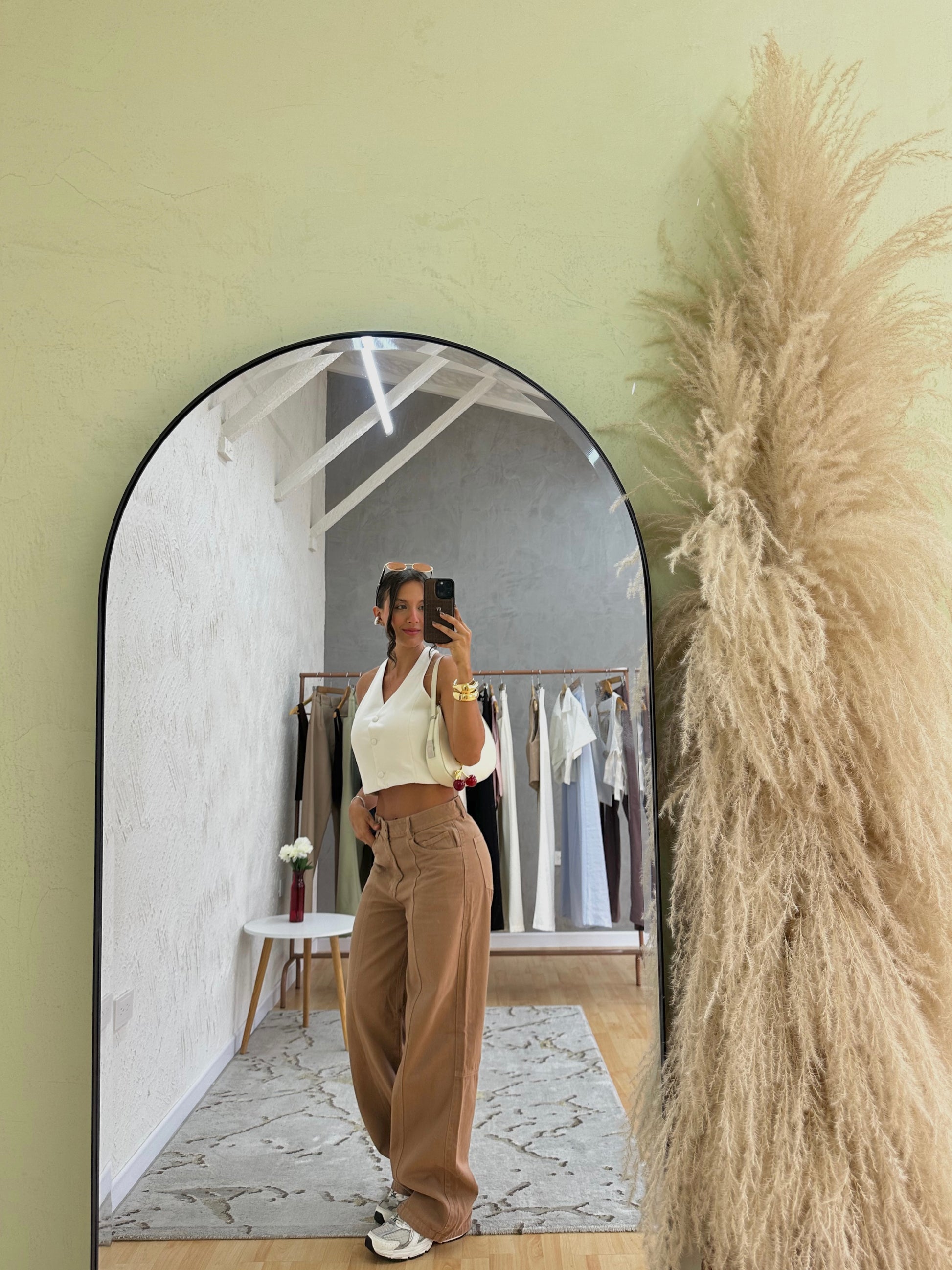 Su tiro medio define la cintura y estiliza la figura, mientras su tono mocca lo convierte en un básico sofisticado y fácil de combinar. El diseño limpio y minimalista lo hace ideal para looks pulidos sin perder frescura.